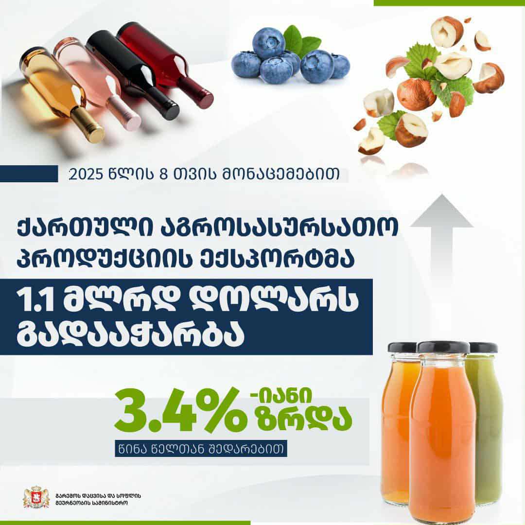 2025 წლის 31 აგვისტოს მდგომარეობით, საქართველოდან აგროსასურსათო პროდუქციის ექსპორტის ღირებულებამ 1 118 მლნ აშშ დოლარი შეადგინა, რაც 3.4%-ით აღემატება წინა წლის ანალოგიურ მაჩვენებელს.