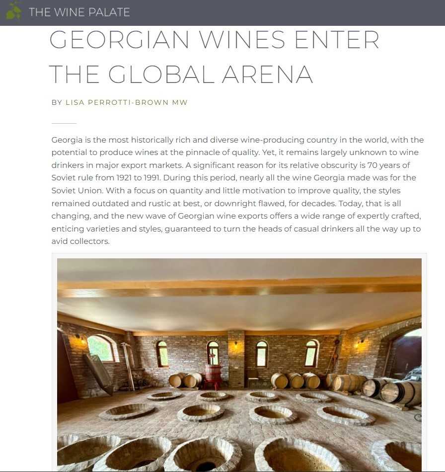 სტატიის ავტორი, ამერიკელი ღვინის მაგისტრი ლისა პეროტი-ბრაუნი (Lisa Perrotti-Brown), ღვინის ეროვნული სააგენტოსა და ამერიკული კომპანიის „Big Sky Ranch Inc” თანამშრომლობის ფარგლებში, საქართველოს ივლისში ეწვია.