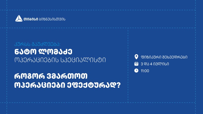 თიბისი აგრძელებს ბიზნესის მხარდაჭერას განათლების კუთხით და ამ კამპანიის ფარგლებში მორიგი ტრენინგი 3 და 4 ივლისს გაიმართება. ტრენინგის თემაა როგორ ვმართოთ ოპერაციები ეფექტურად. ლექციებს გაუძღვება ნატო ლომაძე, ოპერაციების სპეციალისტი.