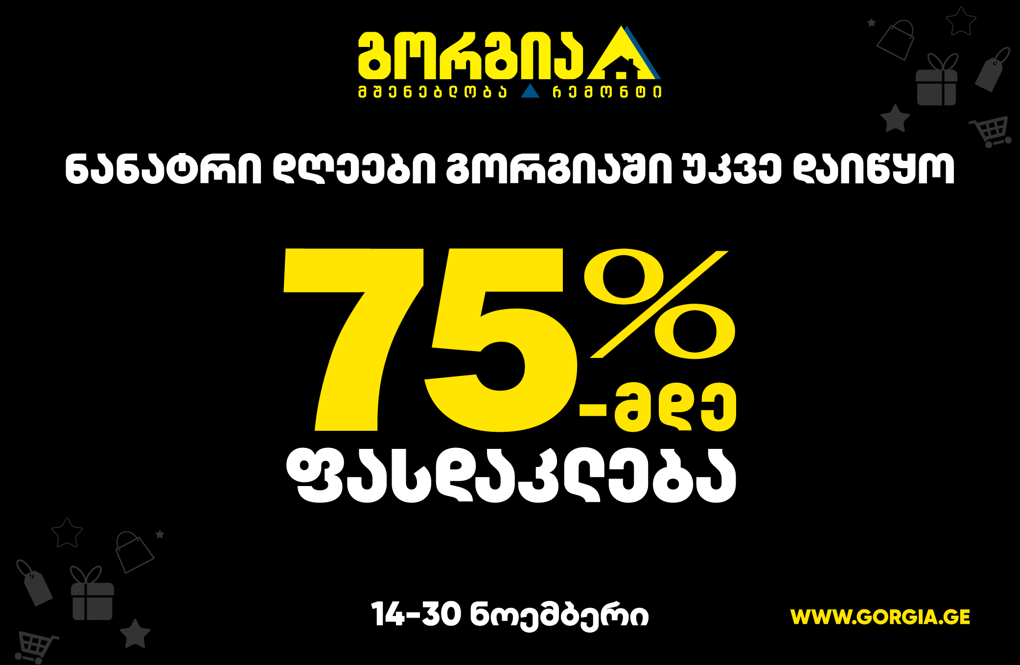 ნანატრი დღეები უკვე აქ არის- გორგიაში შავი პარასკევი დაიწყო. 14 ნოემბრიდან 30 ნოემბრის ჩათვლით მომხმარებლებს 75%-მდე ფასდაკლება დახვდებათ.