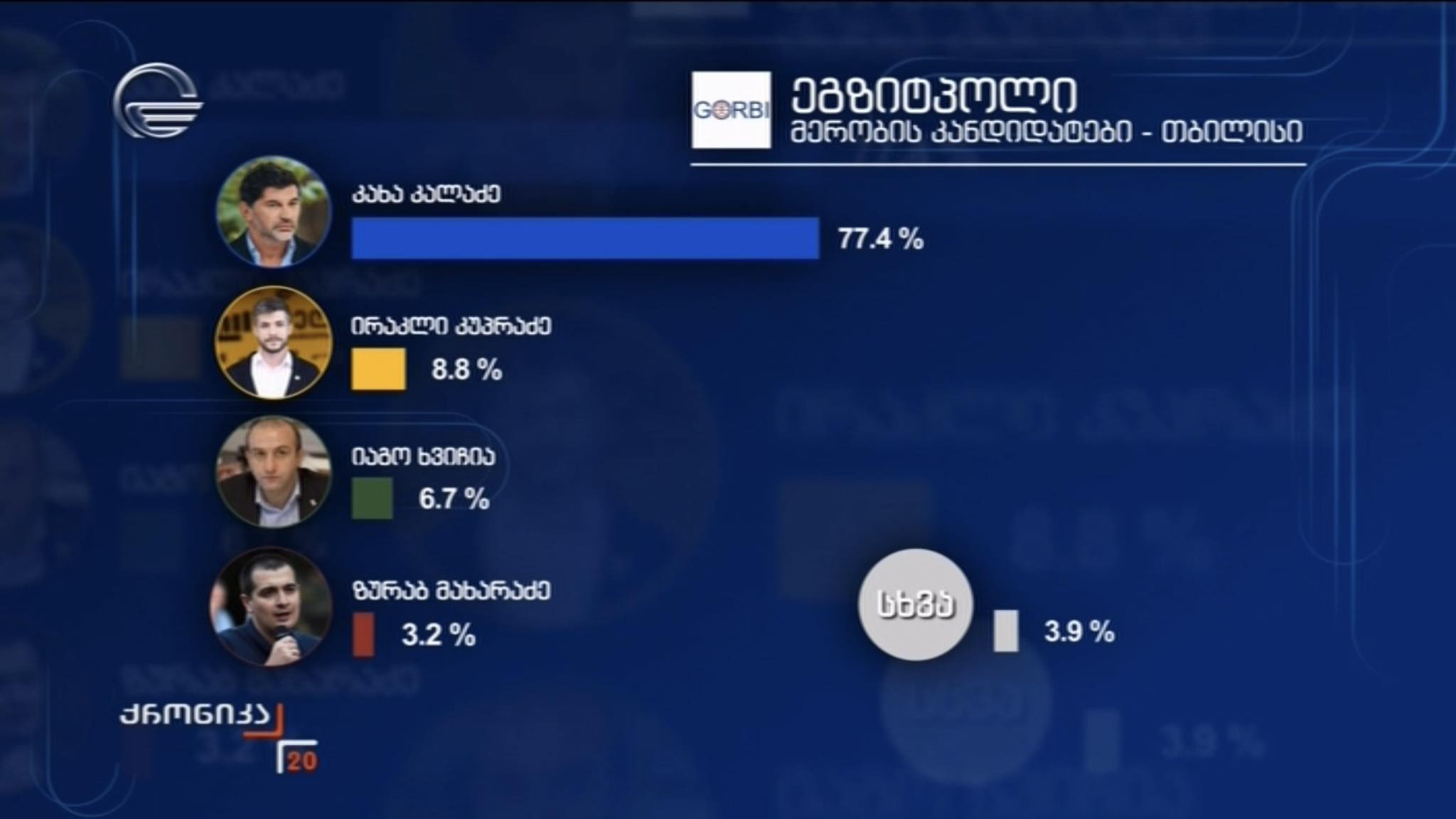 ტელეკომპანია “იმედის“ მიერ ჩატარებული ეგზიტპოლის შედეგებით მიხედვით, თბილისში, საკრებულოს არჩევნებში პარტია „ქართულმა ოცნებამ“ ხმების 76.3% მიიღო, „ძლიერი საქართველო-ლელომ“ – 7.1%, „გირჩმა“ 6.8%, „კონსერვატორები საქართველოსთვის“ 3.3%, ხოლო სხვა პარტიები 6.5%.