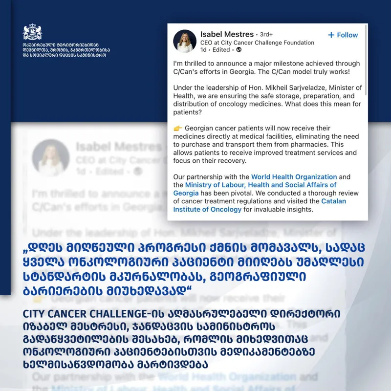 იზაბელ მესტრესი აღნიშნავს, რომ ჯანდაცვის სამინისტროს, მსოფლიო ჯანდაცვის ორგანიზაციისა და City Cancer Challenge-ის პარტნიორობით, ამ მიმართულებით, მნიშვნელოვანი ნაბიჯები გადაიდგა.