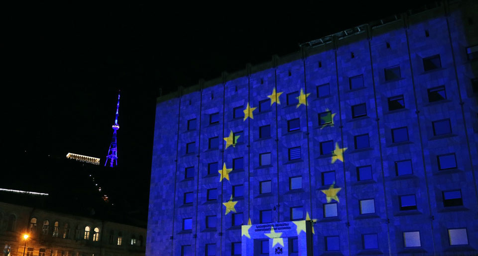 საქართველოს მთავრობის ადმინისტრაციის შენობა ევროკავშირის დროშის ფერებში განათდა.