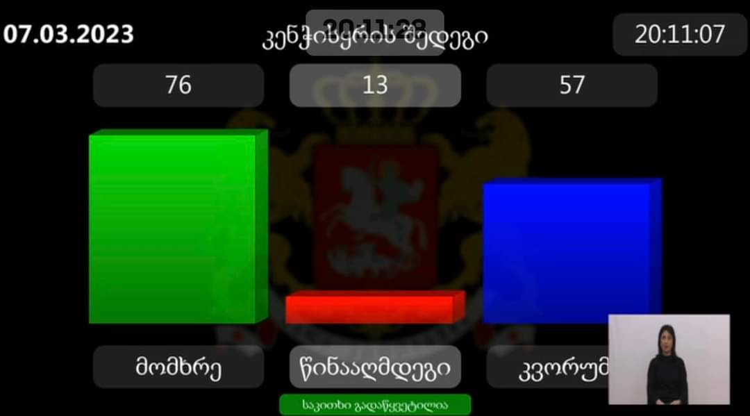პარლამენტმა „უცხოური გავლენის გამჭვირვალობის შესახებ“ კანონპროექტს პირველი მოსმენით მხარი დაუჭირა.კანონპროექტის საარგებლოდ ხმა 76 დეპუტატმა მისცა, წინააღმდეგ კი 13 წავიდა.
