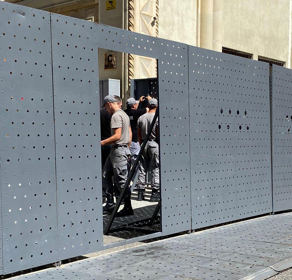 პარლამენტის შენობის წინ განთავსებული რკინის კონსტრუქციის დაშლა მიმდინარეობს.