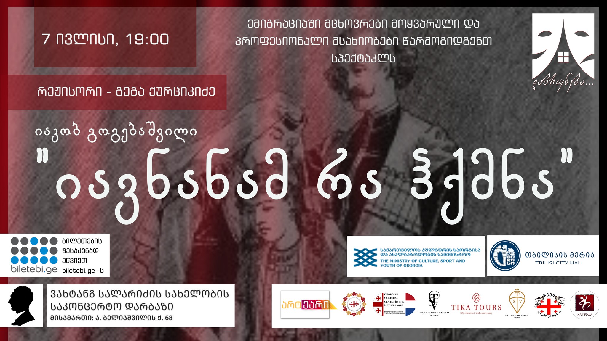 7 ივლისს, 19:00-ზე, ვახტანგ სალარიძის სახელობის საკონცერტო დარბაზში იაკობ გოგებაშვილის „იავნანამ რა ჰქმნა“-ს მოტივებზე შექმნილი სპექტაკლის პრემიერა შედგება.