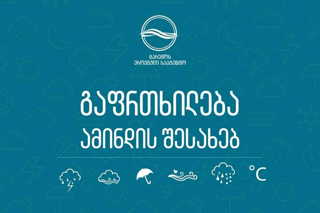 გარემოს ეროვნული სააგენტოს ცნობით, პირველ ივლისს, დღის ბოლოდან 2 ივლისის დღის ბოლომდე საქართველოში მოსალოდნელია დროგამოშვებით წვიმა და ელჭექი, ზოგან ძლიერი, შესაძლებელია სეტყვა და ქარის გაძლიერება.