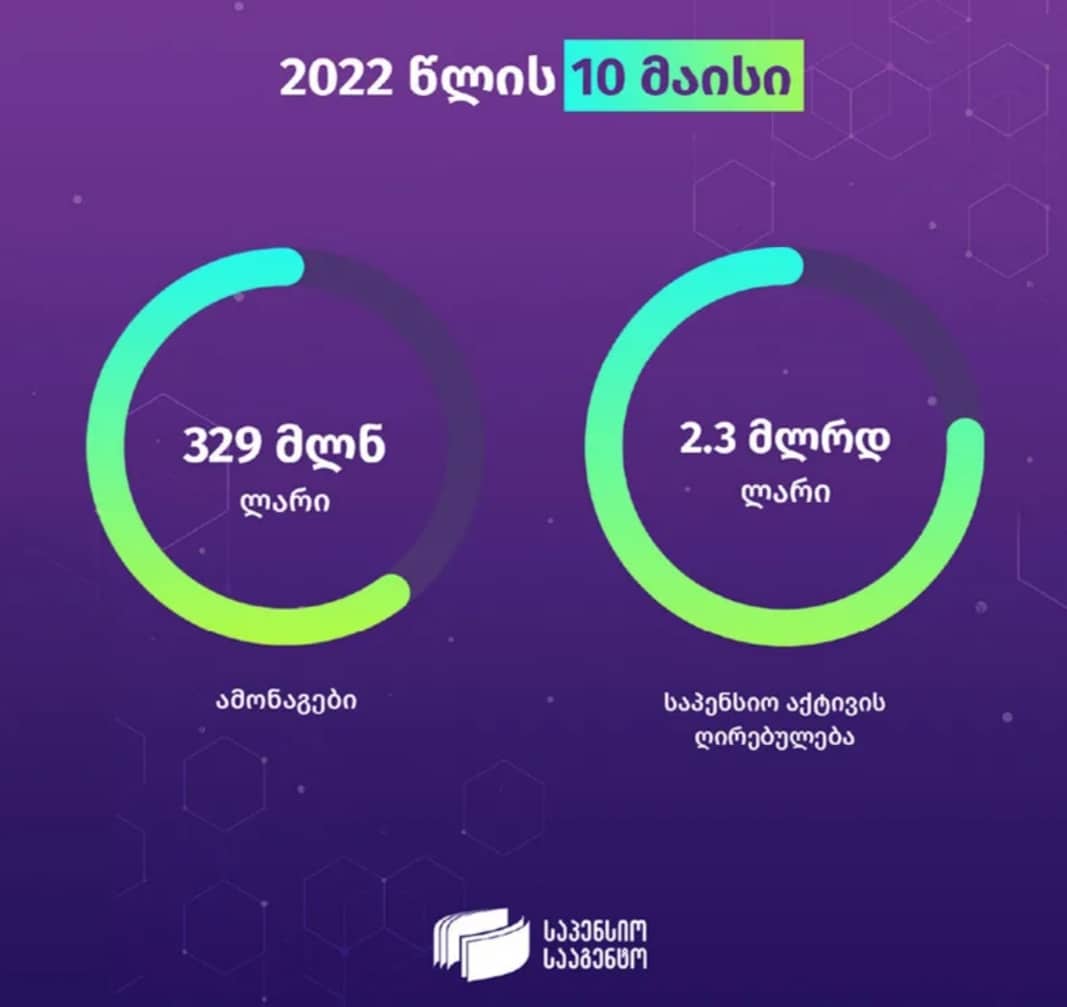 საპენსიო სააგენტომ 2022 წლის 10 მაისის სტატისტიკა გამოაქვეყნა, უწყების ცნობით, 10 მაისის მდგომარეობით მთლიანი საპენსიო აქტივების ღირებულება არის 2.3 მილიარდი ლარი, ხოლო ამონაგები კი 329 მილიონ ლარს შეადგენს.