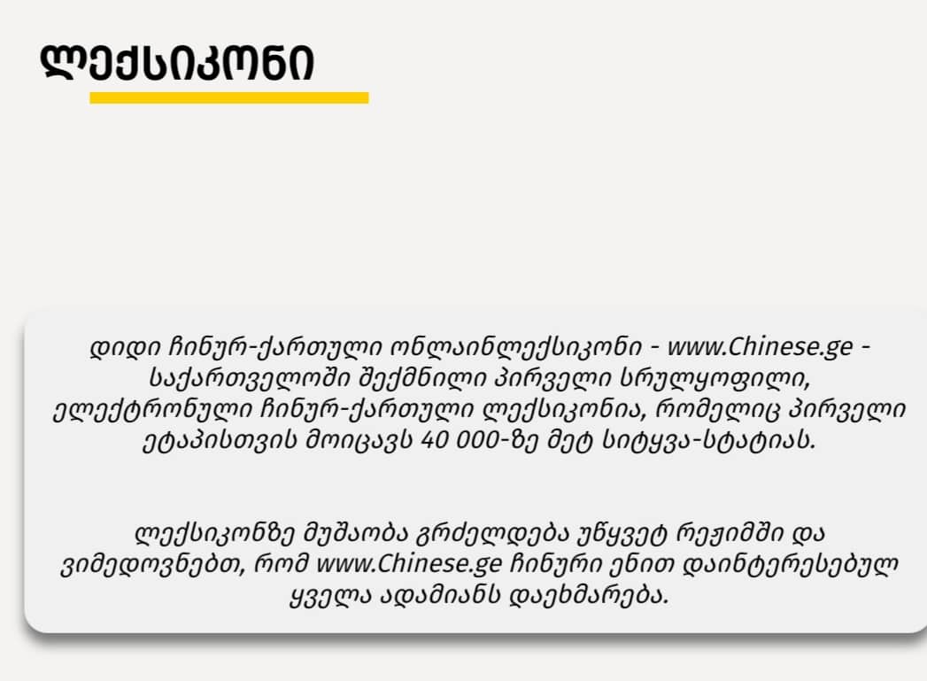 26 აპრილს, პირველი, დიდი ჩინურ-ქართული ონლაინ–ლექსიკონი გაიხსნა, რომელზეც 10 წლის განმავლობაში იმუშავა „ჩინური ენის ცენტრის“ ლექსიკონის სარედაქციო კოლეგიამ, ქართველი სინოლოგების (ჩინეთმცოდნეების) - ზურაბ მამნიაშვილის და თათია სიორიძის ხელმძღვანელობით. ამის შესახებ საინფორმაციო BUSINESS TIME-ს ჩინეთის საელჩოდან აცნობეს.